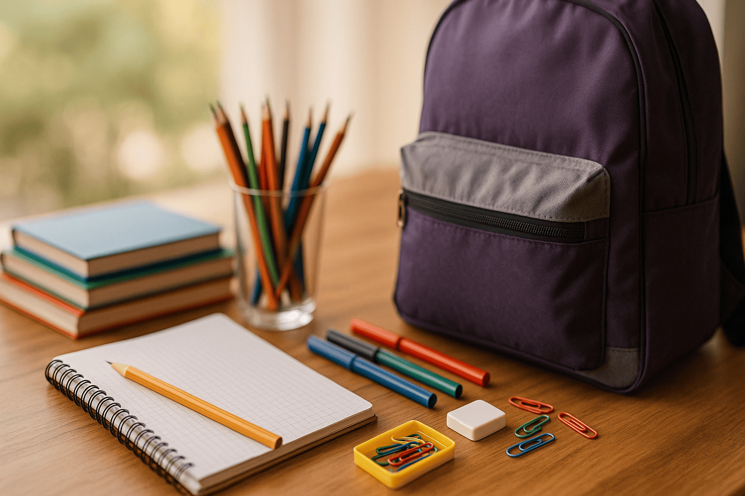 Тетради 12–18 л., обложки, дневник, карандаш НВ, точилку с контейнером, ластик, линейку 20 см, ножницы, клей-карандаш, альбом, цветную бумагу/картон, пенал, ранец и мешок для обуви.
