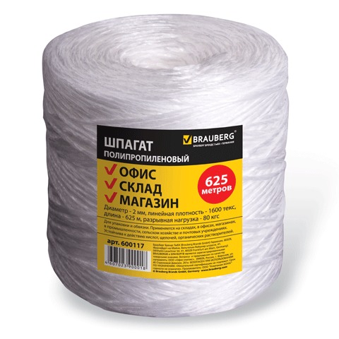 Шпагат применяется для упаковки товаров. Изготовлен из полипропилена. Устойчив к действию кислот, щелочей, органических растворителей.