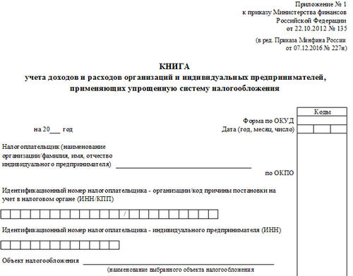Книга учета доходов и расходов (упрощённая система) Приказ № 135н от 22.10.12