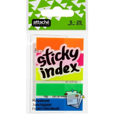 Пластиковые клейкие закладки Attache Selection. Закладки клейкие, ширина которых составляет 12 мм, могут служить закладками в документах, использоваться для записи краткой информации, для выделения текста. Яркие неоновые цвета закладок акцентируют Ваше внимание на нужном моменте в документе или тексте.Прозрачный пластик, из которого они изготовлены, не скрывает при этом самого текста. Клейкие закладки легко удаляются, не оставляя следов и не повреждая бумагу.Одну закладку можно использовать несколько раз. Размер одной закладки 12x45 мм.На закладках можно писать ручкой, чернографитовым карандашом, маркером, фломастером. В упаковке 5 ярких неоновых цвета по 25 листов каждого цвета