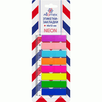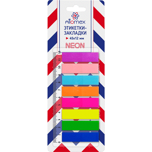 Набор самоклеящихся этикеток-закладок "Attomex" пластиковые полупрозрачные 45x12 мм, 8x25 листов, 8 неоновых цветов, в картонном блистере