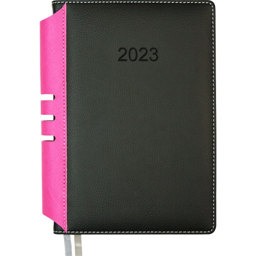 Ежедневник датированный 2023 "deVENTE. Ultra" A5 (145 ммx205 мм) 352 стр, белая бумага 70 г/м², печать в 2 краски, твердая комбинированная обложка из искусственной кожи с поролоном, держатель для ручки, отстрочка, термо тиснение, черный форзац, перфорация, закругленные уголки, 2 ляссе, в термоусадочной пленке, черный с малиновым
