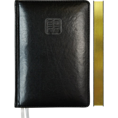 Ежедневник 2022 "deVENTE. Bravo" B6 (120 ммx170 мм) 352 стр, белая бумага 70 г/м² с золотым срезом, печать в 2 краски, твердая обложка из искусственной кожи с поролоном, отстрочка, термо тиснение, цветной форзац с картой, перфорация, закругленные уголки, 2 ляссе, в термоусадочной пленке, черный.
