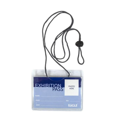 Бейдж горизонтальный с отверстием под клип и на шнурке. Изготовлен из прозрачного мягкого пластика. В комплекте один чистый вкладыш.