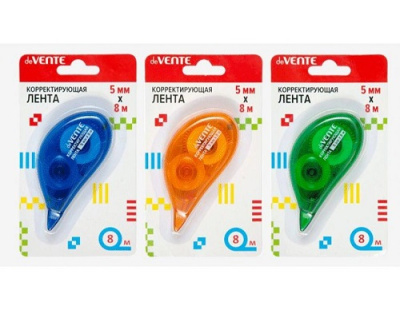 Корректирующая лента deVente 5ммх8м, 3 цвета ассорти (синий, зеленый, оранжевый), фронтальный аппликатор, в картонном блистере.