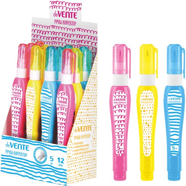 Корректирующая жидкость "deVENTE" 05 мл, быстросохнущая, в ручке (трубчатая система подачи) цвета корпуса ассорти, в картонном дисплее