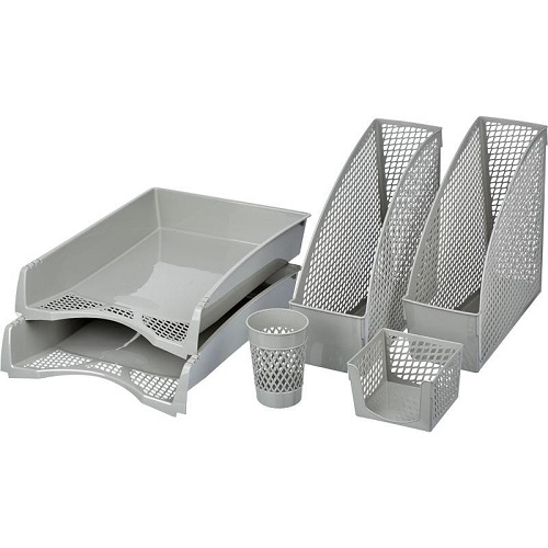 Настольный набор Attache Эконом изготовлен из качественного пластика серого цвета. В набор входит шесть предметов: два горизонтальных лотка для бумаг, два вертикальных накопителя, подставка для письменных принадлежносте, подставка для бумажного блока. Вертикальный накопитель имеет 1 отделение шириной 110 мм. Размеры изделия (ДxШxВ): 255x110x250 мм. Этикетки в комплект поставки не входят. Горизонтальный лоток для бумаг Attache Эконом компактно сохранит на рабочем столе документацию, проспекты, каталоги и другую продукцию формата А4.Размер лотка - 340x270x71 мм. Высота боковой стороны 71 мм. Подставка для бумажного блока выполнена в форме куба. Размер 100х100х68 мм. Подходят для блоков 90x90x50 мм. Эргономичная подставка для письменных принадлежностей имеет размер 74х55х100 мм, Поставляется без наполнения. Не является вращающейся.