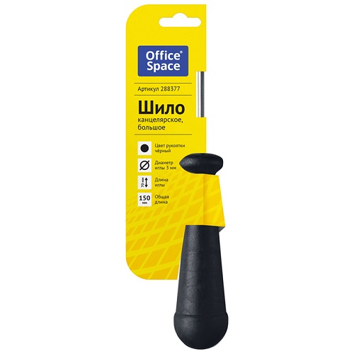 Большое канцелярское шило используется для прошивки документов и прокалывания бумаги. Цвет пластиковой рукоятки - черный. Диаметр шила 3 мм, длиной 70 мм, общая длина шила 150 мм. Имеет никелевое покрытие. Изделие может обеспечить прокалывание до 30 листов бумаги за один прокол.