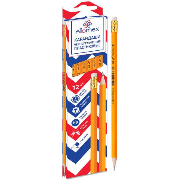 Карандаш чернографитный "Attomex" HB, диаметр грифеля 2 мм, шестигранный с ластиком, индивидуальная маркировка, пластиковый желтый корпус.