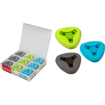 Ластик "deVENTE. Triolino" синтетический каучук, треугольный цветной, 41x42x10 мм, с пластиковым держателем, dust-free, ассорти 3 цвета, в индивидуальной упаковке с штрих кодом, в картонном дисплее.