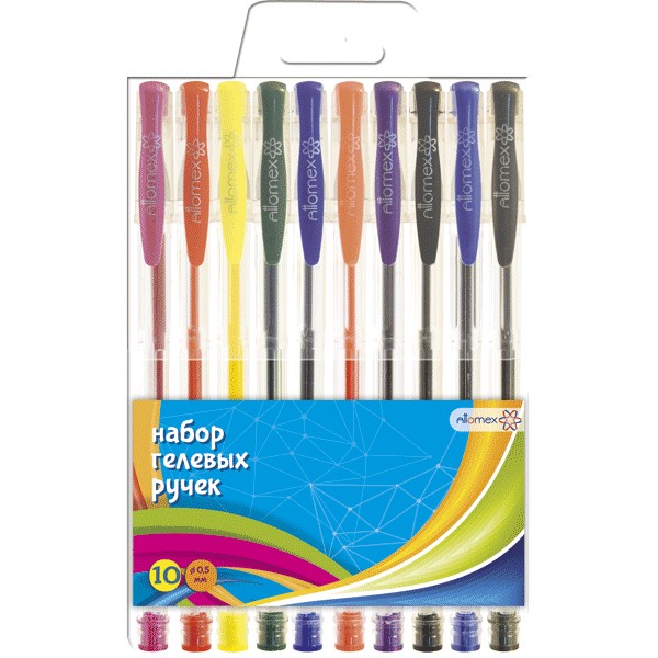 Набор гелевых ручек Attomex 10 цв в пластиковом прозрачном шестигранном корпусе с металлическим наконечником и вентилируемым колпачком. Детали корпуса ручек выполнены в цвет чернил. Стандартный пишущий узел d=0,5 мм оставляет линию письма толщиной 0,3 мм. Длина сменного стержня 130 мм.