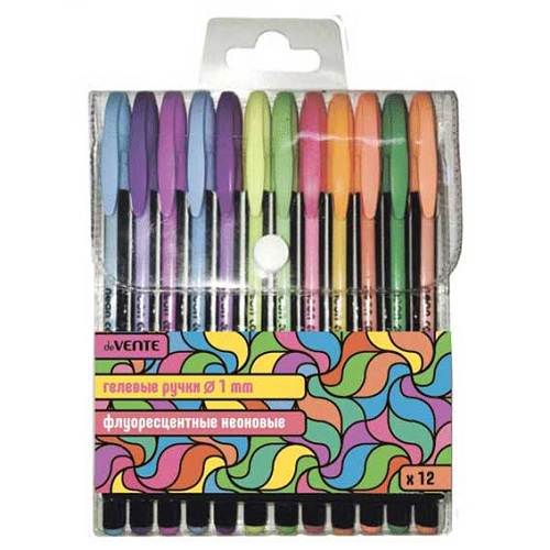 Набор гелевых ручек deVENTE Neon Black 12 цв в пластиковом круглом корпусе черного цвета с полосами в цвет чернил. Стандартный пишущий узел d=1,0 мм оставляет линию письма толщиной 0,45 мм. Длина сменного стержня 130 мм.