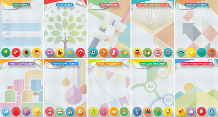 В комплекте 10 картонных вкладышей. Разделы: "Портфолио", "Моя семья", "Мои любимые книги", "Мои друзья", "Мое творчество", "Мои впечатления", "Мои увлечения", "Пожелания учителей", "Мои праздники", "Мои достижения".