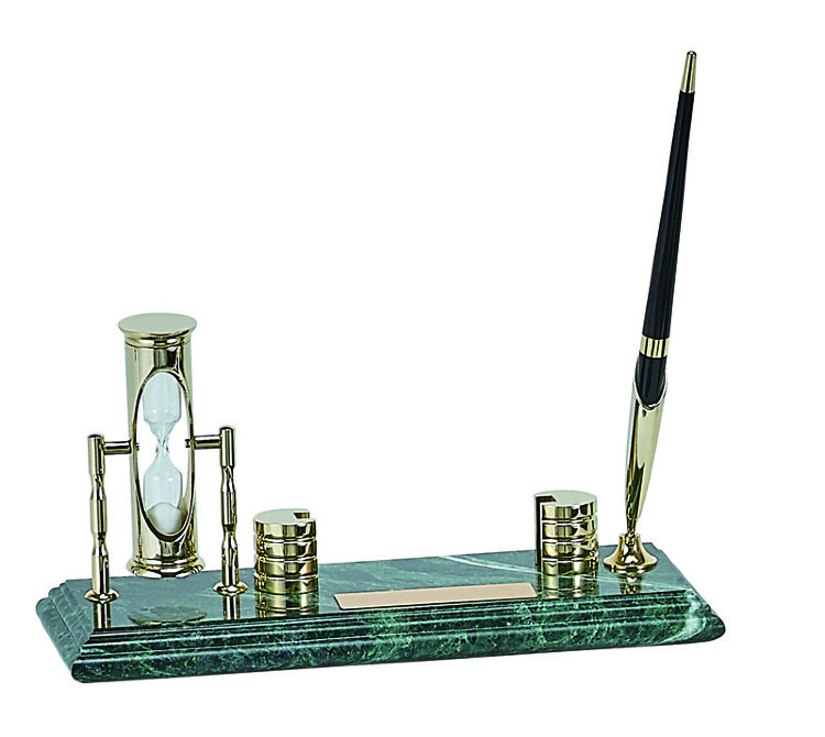 Набор настольный подарочный "deVENTE. Deluxe" с подставкой под бумажный блок, песочными часами на 3 минуты и ручкой, темно-зеленый мрамор с золотистой отделкой, размер основания 26x11x1,8 см, в подарочной коробке