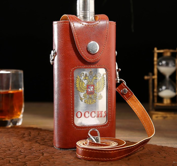 Фляжка 330 мл "Герб России", на ремне, в коричневом чехле, хромированная, 8х4х18.5 см