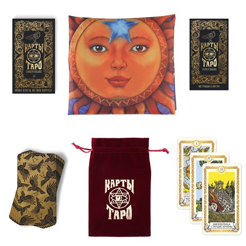 В наборе вы найдёте брошюру с подробным толкованием каждой карты, а также описанием вариантов раскладов и правилами работы со скатертью.