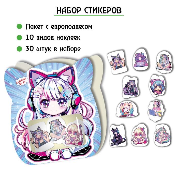 В наборе 30 стикеров (10 видов по 3 шт.), 30×40 мм. Фигурная вырубка, самоклеющаяся бумага. Индивидуальная упаковка в пакете с европодвесом.
