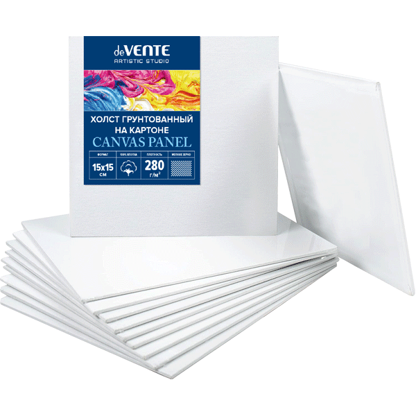 Холст на картоне 15x15 см грунтованный "deVENTE" 100% хлопок 280 г/м², мелкое зерно, цвет белый, термоусадочная пленка.