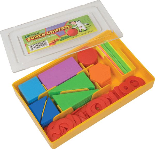 В состав входят: прямоугольник -10 шт., квадрат -10 шт., прямоугольный треугольник - 20 шт., равнобедренныйтреугольник - 20 шт., круг - 10 шт., пятиугольник - 10 шт., цифры от 0 до 9 - 2 комплекта (20 шт.), математическиезнаки + - =<> 12 шт., счетные палочки - 20 шт.